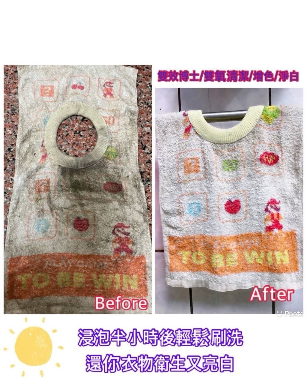 • 針對泛黃、汗漬、油漬,浸泡即可恢復潔白