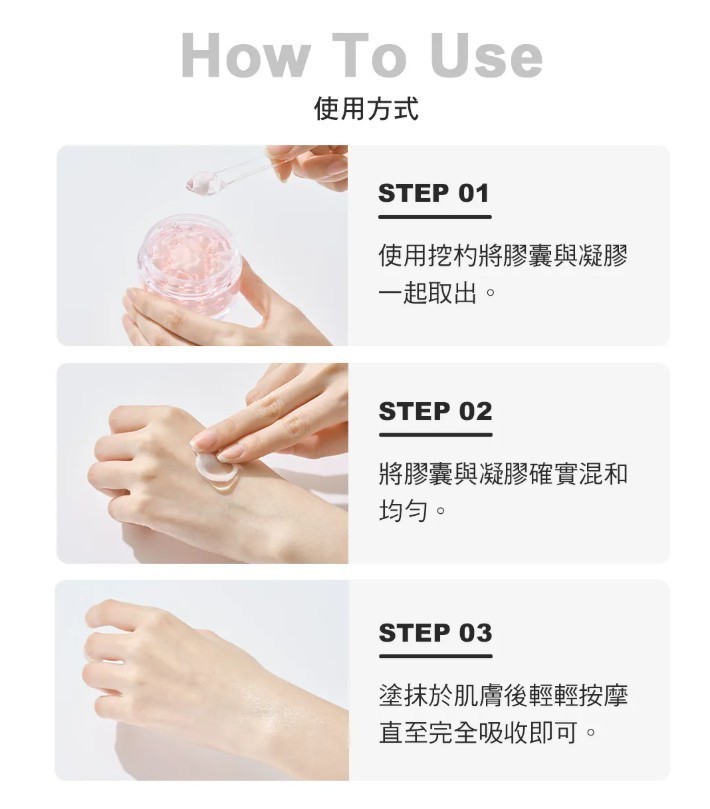 將膠囊乳霜與凝膠一起取出(約1顆珍珠大小)後,